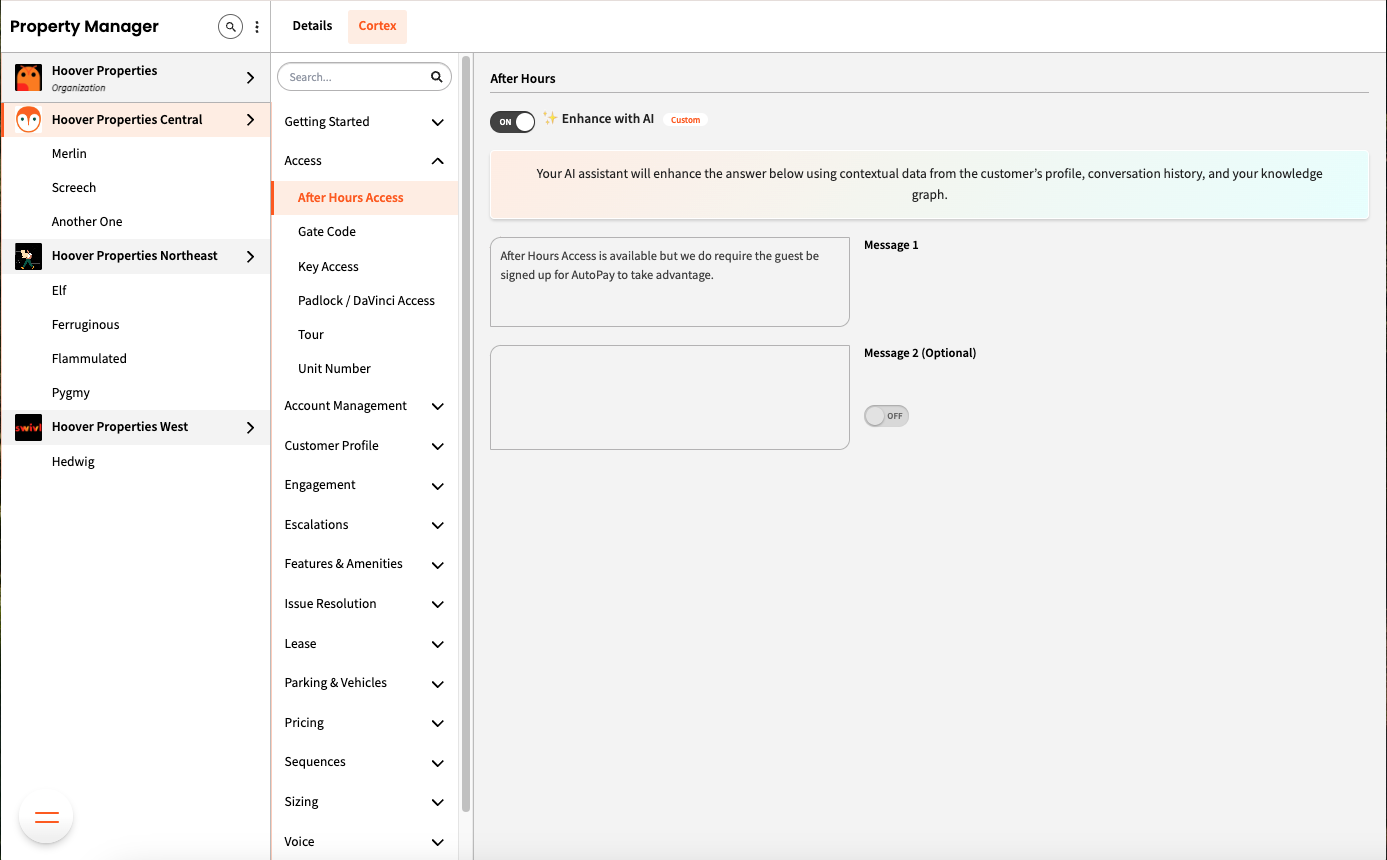The remaining sections within My Storage (Access, Account Management, Features & Amenities, Issue Resolution, Lease, and Pricing) allow you to customize how your bot replies to customers with no coding required!