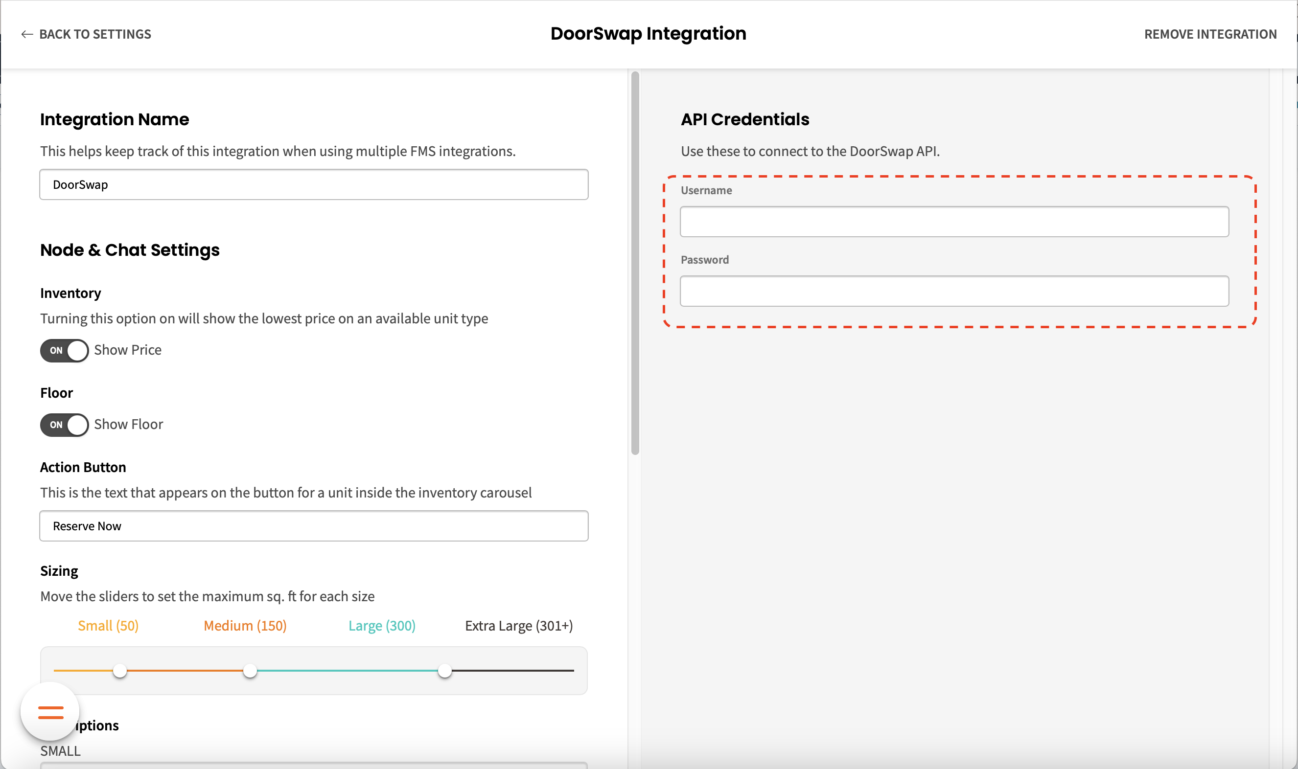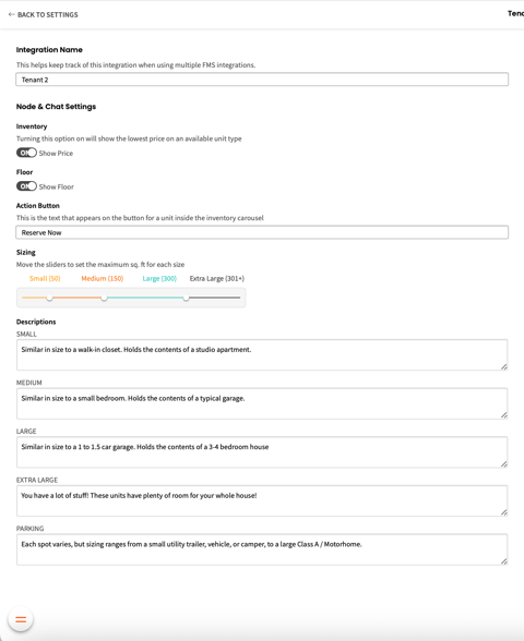 4. In the left panel you can rename the integration and adjust other chat settings, such as the size and descriptions of your small, medium, large, and extra large units
