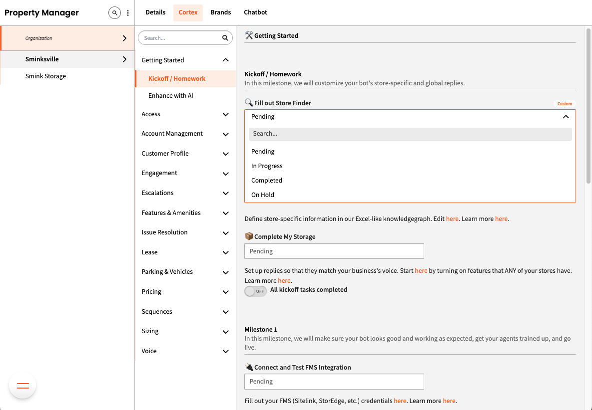 The Getting Started worksheet helps you and your team track your setup progress. Each task has four statuses: Pending, In Progress, Completed, and On Hold. When all tasks within a section are Completed, switch the toggle at the bottom of the section ON to hide that section.