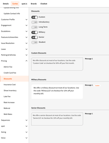 Once a discount is toggled on, a message field (worksheet) will appear below for that specific discount type.