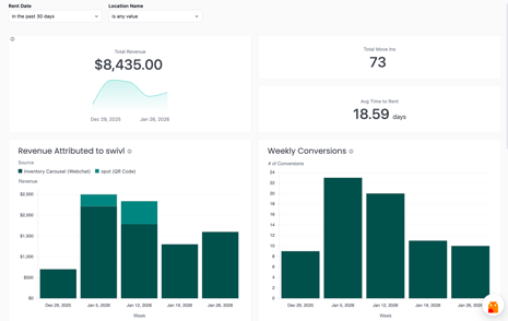 See exactly how swivl is performing across your locations. Track revenue from AI-assisted rentals, monitor what tenants are asking about, and identify what needs attention - all in one place.