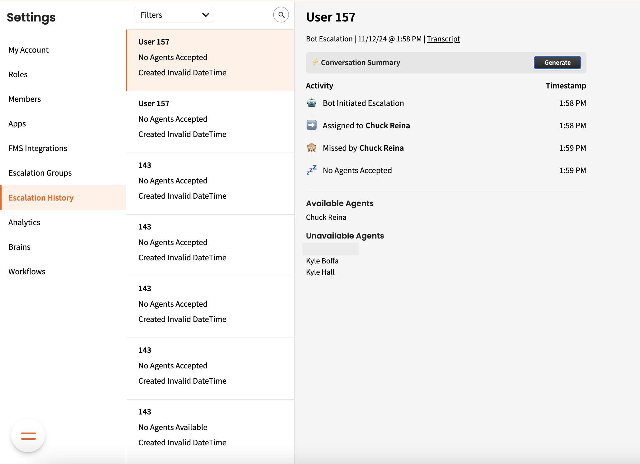 Escalation History allows you to see who a chat was assigned to, what the conversation was about, a sentiment score, and more. If this feature isn’t available to you, reach out to sales@tryswivl.com for more information.