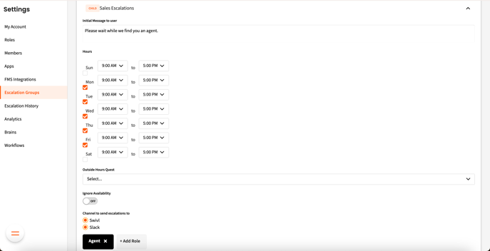 Channel to Send Escalations to - Choose swivl if you’ll be using the Conversations section of swivl, or Slack if you’ve setup that integration.