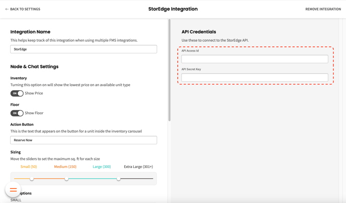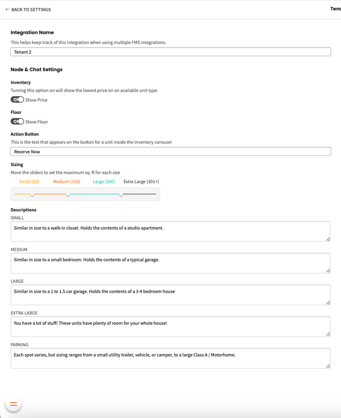 4. In the left panel you can rename the integration and adjust other chat settings, such as the size and descriptions of your small, medium, large, and extra large units